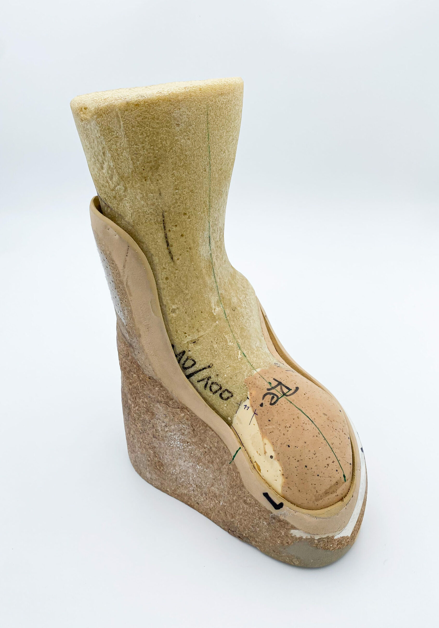 4. Die zuvor erhaltenen Gipsformen werden jetzt genutzt, um Beinleisten aus PU-Schaum herzustellen. An den Beinleisten werden mittels eines durchsichtigen Probeschuhs die richtige Paßform und die genaue Beinstellung gemessen, um den orthopädischen Nutzen des Schuhs zu gewährleisten.