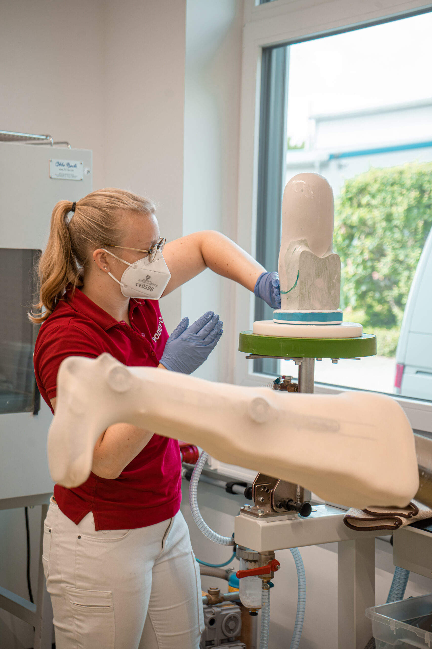 - Professionelles Zuschneiden von Material für die Prothesenherstellung.