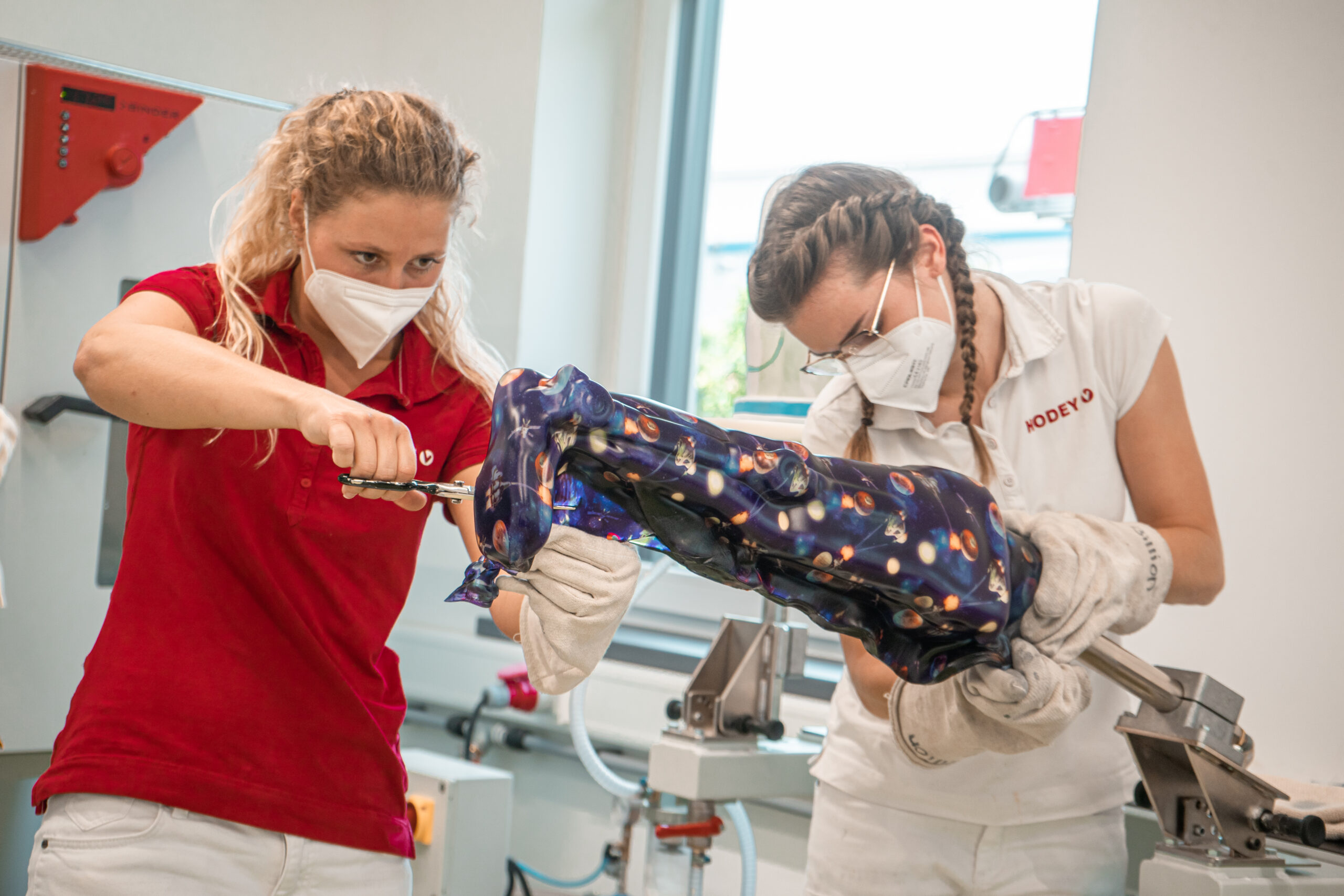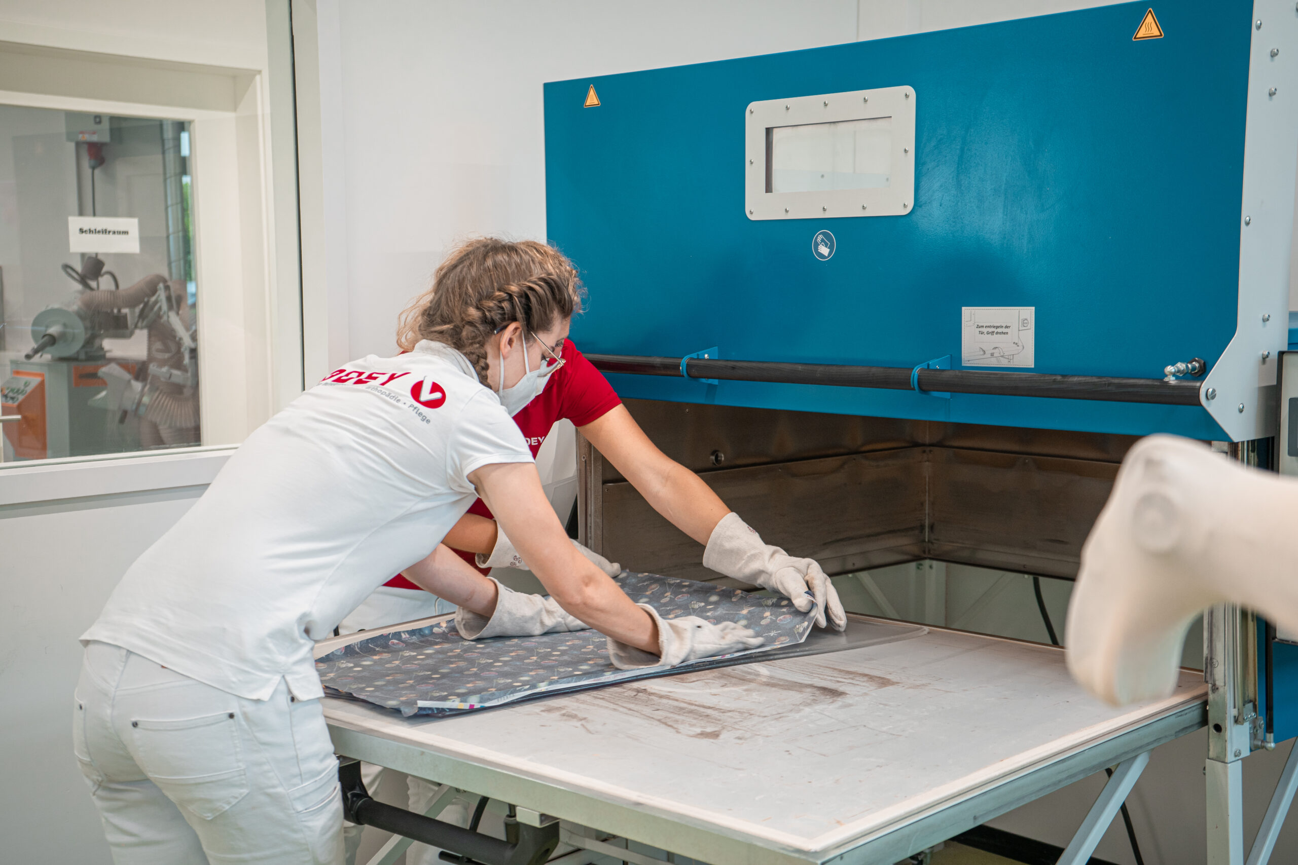 Mit der Rodin-Software, verfügt HODEY über ein digitales Modellierprogramm. Auf Basis des erstellten Modells wird das Hilfsmittel angefertigt. Ein Schritt für die Orthesenfertigung kann hier die Weiterverarbeitung mit thermoplastischen Kunststoffplatten sein. In einem Infrarot-Wärmeofen wird das Material erhitzt, bis es weich und formbar ist. Auch hier sorgen diverse Absaugvorrichtungen für die Fertigung von thermoplastischen Orthesen oder klarsichtigen Prothesenschäften.